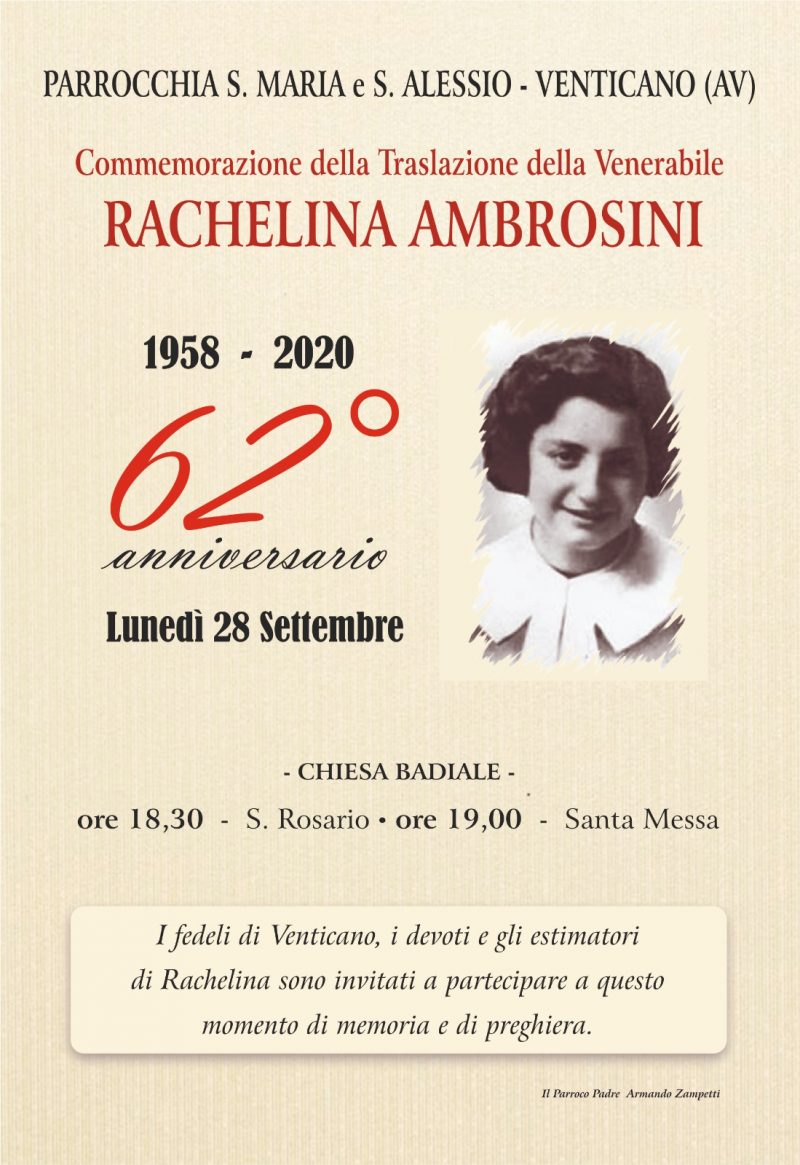 La parrocchia S. Maria e S. Alessio in Venticano (Av) commemora la traslazione della venerabile Rachelina Ambrosini lunedì 28 settembre. Per il programma vedi il manifesto…