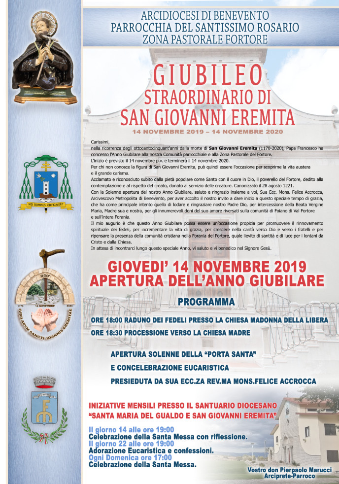 Sabato 9 novembre, alle ore 12, nella sala verde del palazzo arcivescovile in piazza Orsini 27 conferenza stampa per la presentazione del Giubileo straordinario di San Giovanni Eremita. Saranno presenti i parroci del Fortore ed interverranno don Pierpaolo Marucci che spiegherà il significato dell’evento; don Luigi Colucci che illustrerà il logo; don Armando Valerino presenterà il cammino di San Giovanni Eremita e don Luigi Ulano darà lettura del programma; concluderà l’arcivescovo metropolita di Benevento mons. Felice Accrocca.