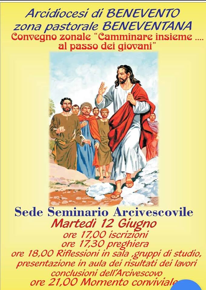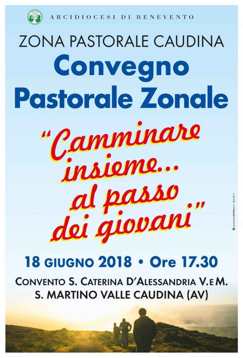 Lunedì 18 giugno, presso il convento Santa Caterina D’Alessandria v. m. In San Martino Valle Caudina, si terrà il convegno pastorale della zona caudina sul tema: “Camminare insieme… al passo dei giovani”. Il convegno inizierà, alle ore 17. 30 con l’iscrizione dei partecipanti e seguirà la preghiera iniziale; alle ore 18 il saluto del vicario foraneo don Ivano Bosco, poi la riflessione sul tema a cui seguiranno i gruppi di studio e le conclusioni dell’arcivescovo mons. Felice Accrocca. La tematica scelta verte sui giovani in attesa del Sinodo di ottobre voluto da Papa Francesco.