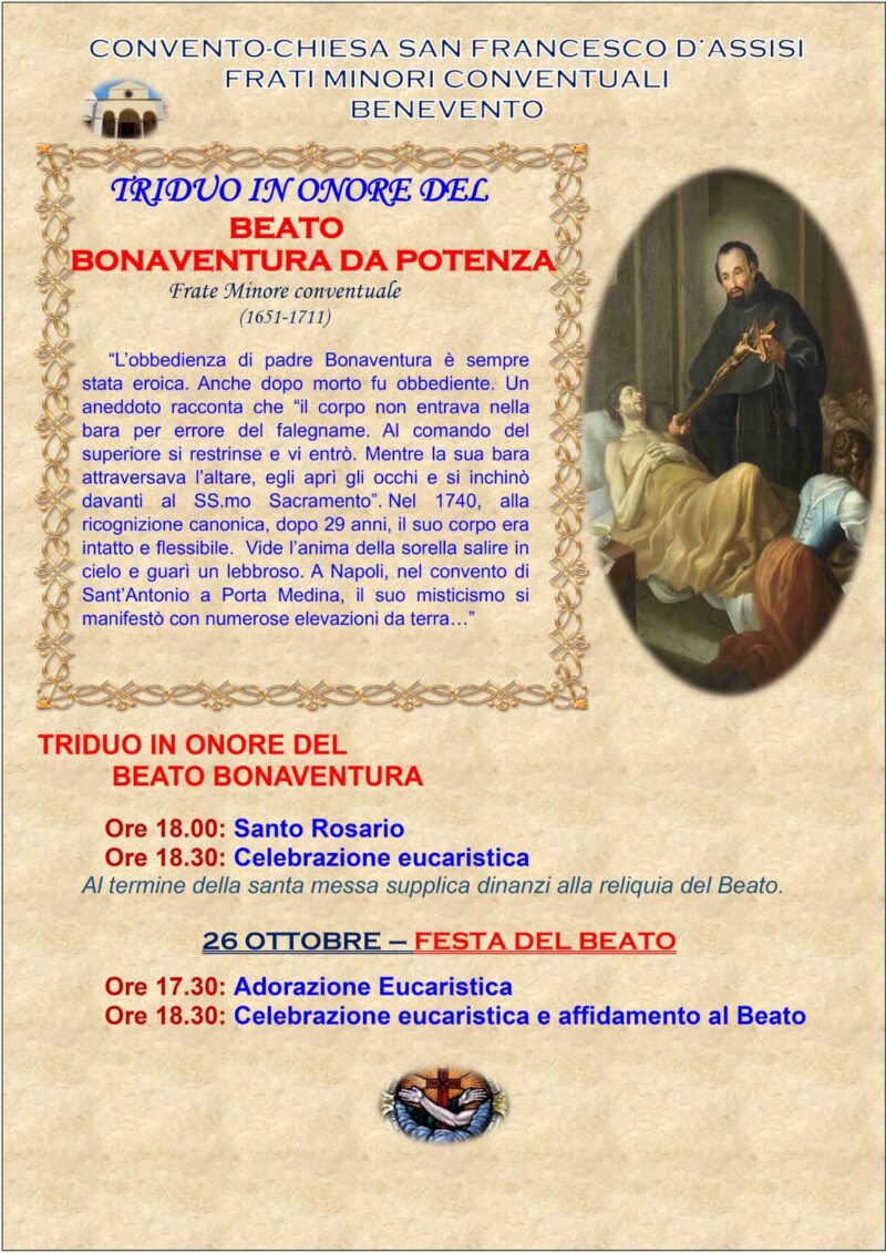 Convento di S. Francesco alla Dogana: triduo per il Beato Bonaventura Nel convento-chiesa di S. Francesco alla Dogana di Benevento triduo per il Beato da Bonaventura da Potenza. Per il programma vedi il manifesto…
