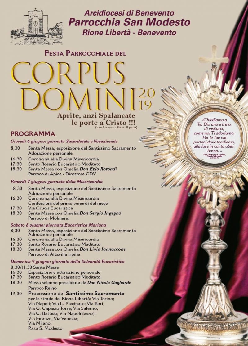 Via aspettiamo numerosi per vivere come comunità parrocchiale, rionale, cittadina, questo momento di fede di lode. Ci saranno Sacerdoti parroci di comunità della nostra diocesi che ci aiuteranno a conoscere sempre meglio il grande dono dell’Eucaristia nei giorni del Triduo 6-7-8 Giugno alle ore 18:30 e Domenica 9 alla Processione del SS. Sacramento che inizierà alle ore 19:30, dopo la Solenne Celebrazione Eucaristica delle 18:30.