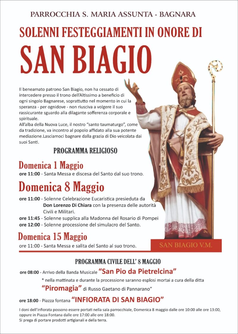 Nei giorni 1°, 8 e 15 maggio  la parrocchia Santa Maria Assunta di Bagnara è in festa per San Biagio. La comunità parrocchiale guidata dal parroco don Antonio Bonavita è pronta per festeggiare il santo patrono. Per il programma vedi il manifesto…