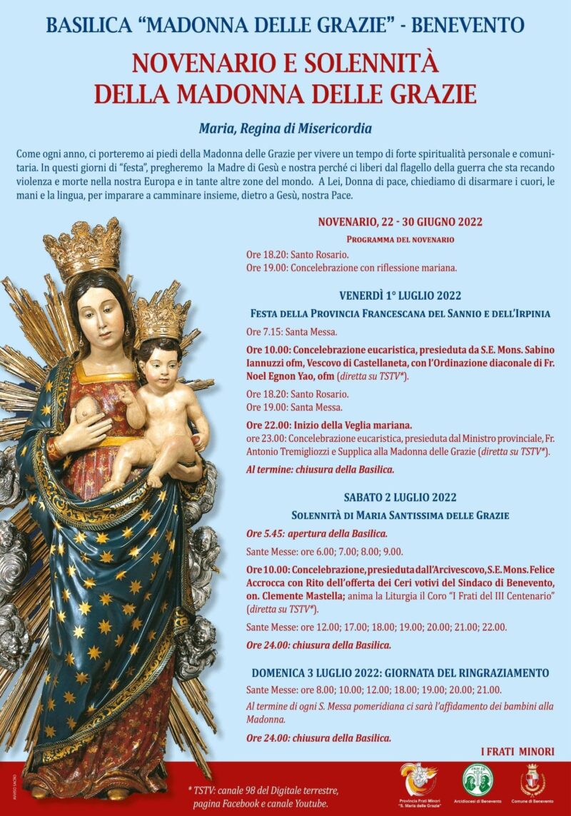 La festa della Madonna delle Grazie, Patrona di Benevento e Regina del Sannio, vive il suo clou come da tradizione secolare nei giorni 1, 2 e 3 luglio 2022. Presso la Basilica di viale San Lorenzo a Benevento, retta dai frati minori francescani, è già incessante il pellegrinaggio di fedeli provenienti da ogni comunità del Sannio e dell’Irpinia. Sul manifesto tutto il programma ….