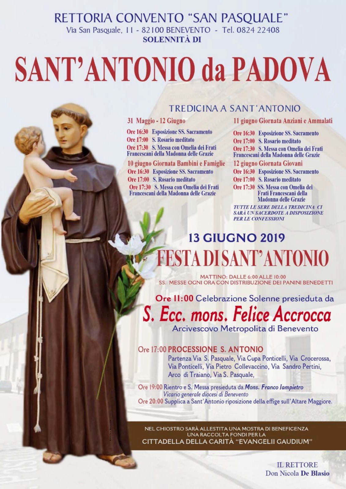 La tradizionale festa di Sant’Antonio di Padova, si rinnova anche quest’anno. Prepariamoci a vivere l’esperienza di Sant’Antonio rinnovando il nostro stile di vita conformandolo agli insegnamenti del Vangelo che ha illuminato e sostenuto la vita del Santo da Padova. Il santo si festeggia a Benevento nella rettoria convento di “San Pasquale” ed il rettore don Nicola De Blasio ha preparato il programma della festa. Continua e scarica il programma della festa di Benevento nella rettoria convento di San Pasquale…