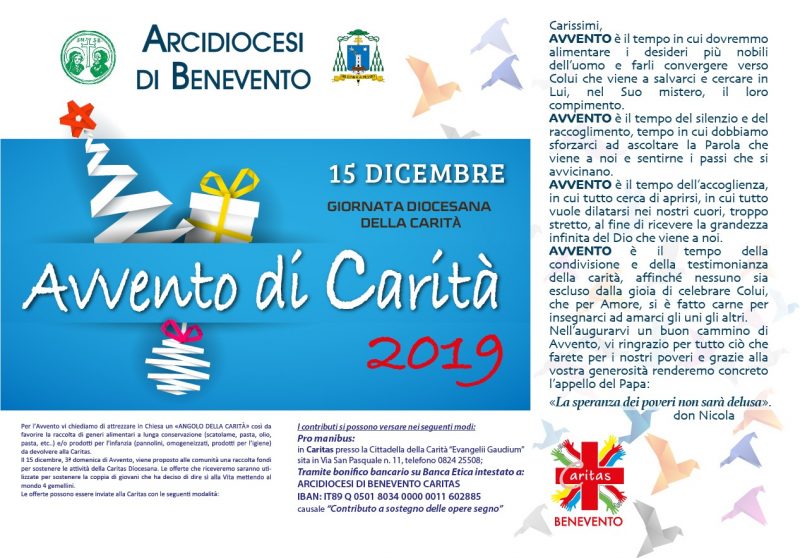 La Giornata pro Caritas diocesana si celebra domenica 15 dicembre 2019, terza di Avvento. Nel suo messaggio per l’Avvento don Nicola De Blasio, direttore della Caritas di Benevento, ci invita ad attrezzare in chiesa un “angolo della Carità” così da favorire la raccolta di generi alimentari di lunga conservazione da devolvere alla Caritas diocesana. Le offerte ricevute saranno utilizzate per sostenere la coppia di giovani che ha deciso di dire sì alla vita mettendo al mondo 4 gemellini….