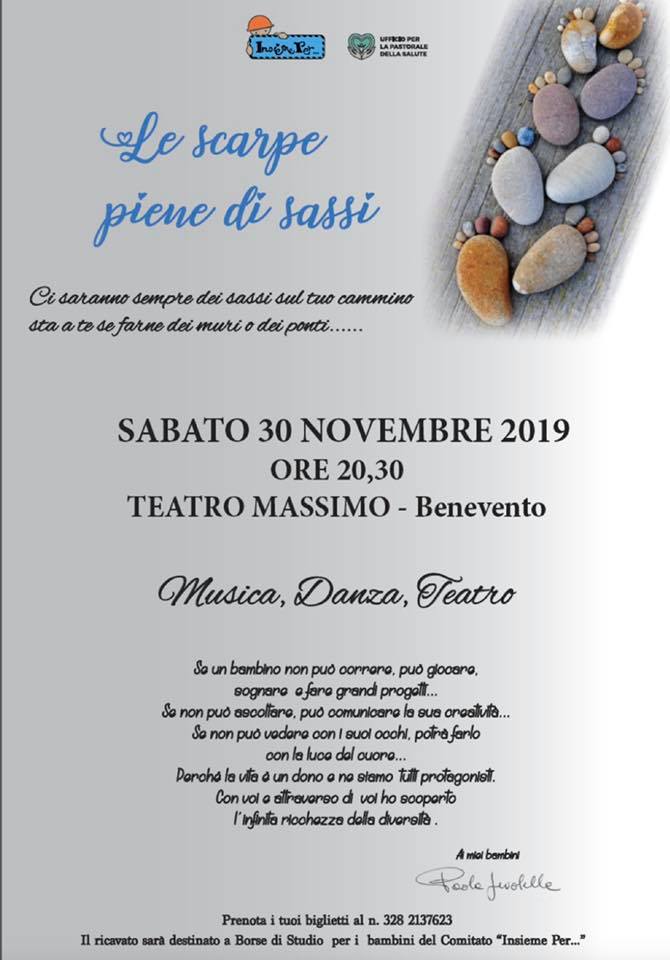 Per la giornata internazionale della disabilità, l’Ufficio per la pastorale della salute e il Comitato Insieme Per… organizzano un evento speciale: “Le scarpe piene di sassi” con musica, danza e teatro. I fondi raccolti dalla serata serviranno a sostenere e incentivare le capacità creative, artistiche e culturali dei ragazzi del comitato. Appuntamento al 30 novembre ore 20.30 presso il Teatro Massimo di Benevento. Info sul manifesto allegato…