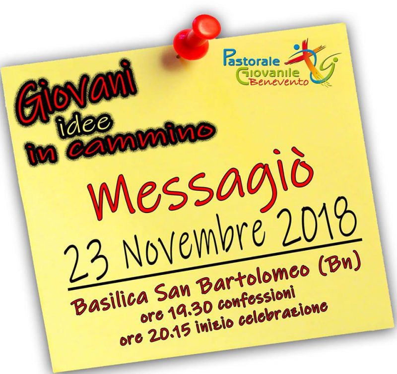 Venerdì 23 novembre, presso la basilica di San Bartolomeo Apostolo a Benevento, prenderà il via il primo appuntamento di quest’anno di Messagiò, organizzata dalla Pastorale Giovanile che coinvolge giovani delle varie realtà parrocchiali e associative. Ci si ritroverà in basilica a partire dalle ore 19.30, con la possibilità delle confessioni e alle ore 20.15 inizierà la celebrazione eucaristica. Il tema scelto per l’anno “Giovani in cammino” , richiama i temi espressi da Papa Francesco nella lettera per la XXXIII Giornata mondiale della gioventù che si terrà a Panama a gennaio 2019.