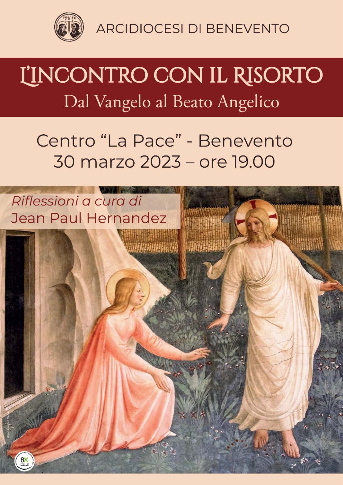 Giovedì 30 marzo 2023 al Centro “La Pace” di Benevento, alle ore 19, padre Jean-Paul Hernandez, sacerdote, gesuita, teologo ed esperto d’arte, terrà una riflessione sul tema: “L’incontro con il Risorto” dal Vangelo al Beato Angelico. Attualmente padre Hernandez spiega e commenta per Tv2000 nella trasmissione “Sulla Strada”, il Vangelo della domenica, in chiese e basiliche che conservano tesori d’arte. “L’appuntamento al Centro “La Pace” di Benevento rientra tra le iniziative che l’Arcidiocesi di Benevento ha in programma per i prossimi anni sulla scorta delle indicazioni della lettera pastorale dell’arcivescovo, mons. Felice Accrocca, “Lampada ai nostri passi”, nella quale il presule, ponendo l’accento sull’importanza di ancorare la vita della Chiesa alla Parola di Dio, offre suggerimenti concreti e spunti di approfondimento”.