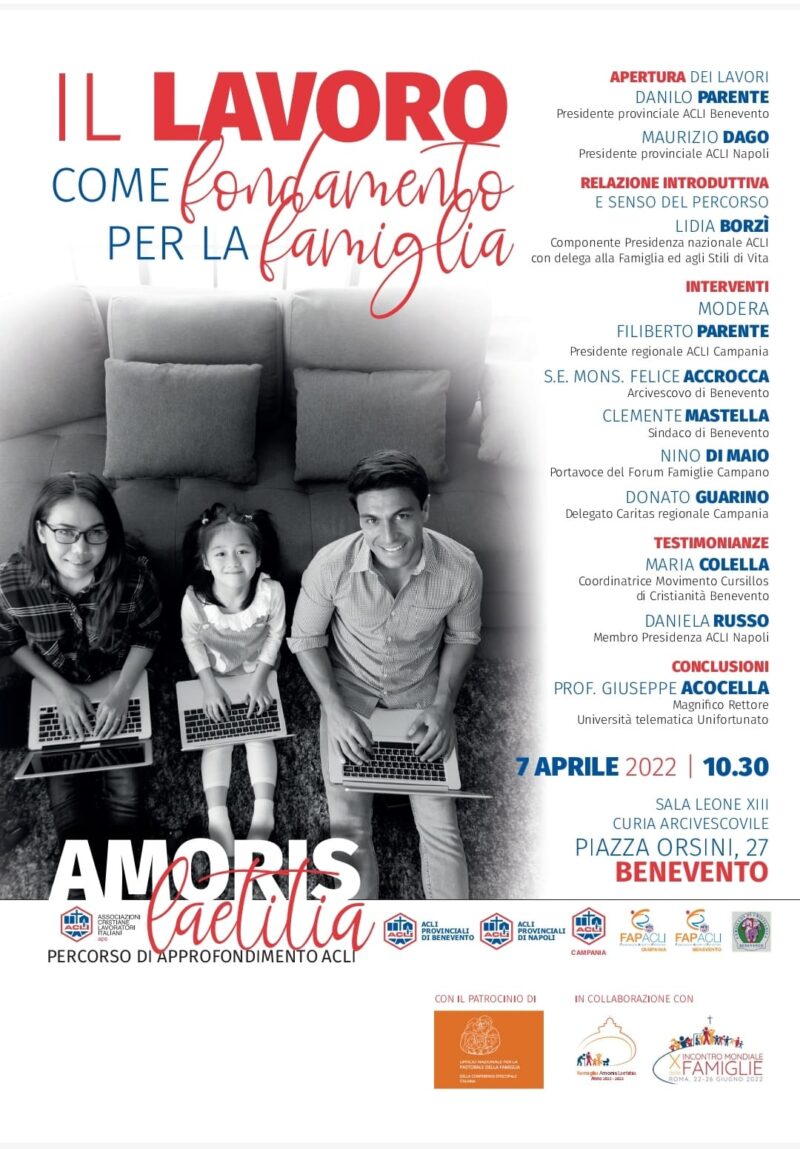 Il percorso di approfondimento Acli Campania sull’enciclica “Amoris laetitia” fa tappa a Benevento il 7 aprile. Appuntamento nel salone Leone XIII del palazzo arcivescovile, inizio dei lavori ore 10,30, per riflettere sulla tematica: “Il lavoro come fondamento per la famiglia”. E’ previsto l’intervento dell’arcivescovo mons. Felice Accrocca. Per l’intero programma vedi locandina…