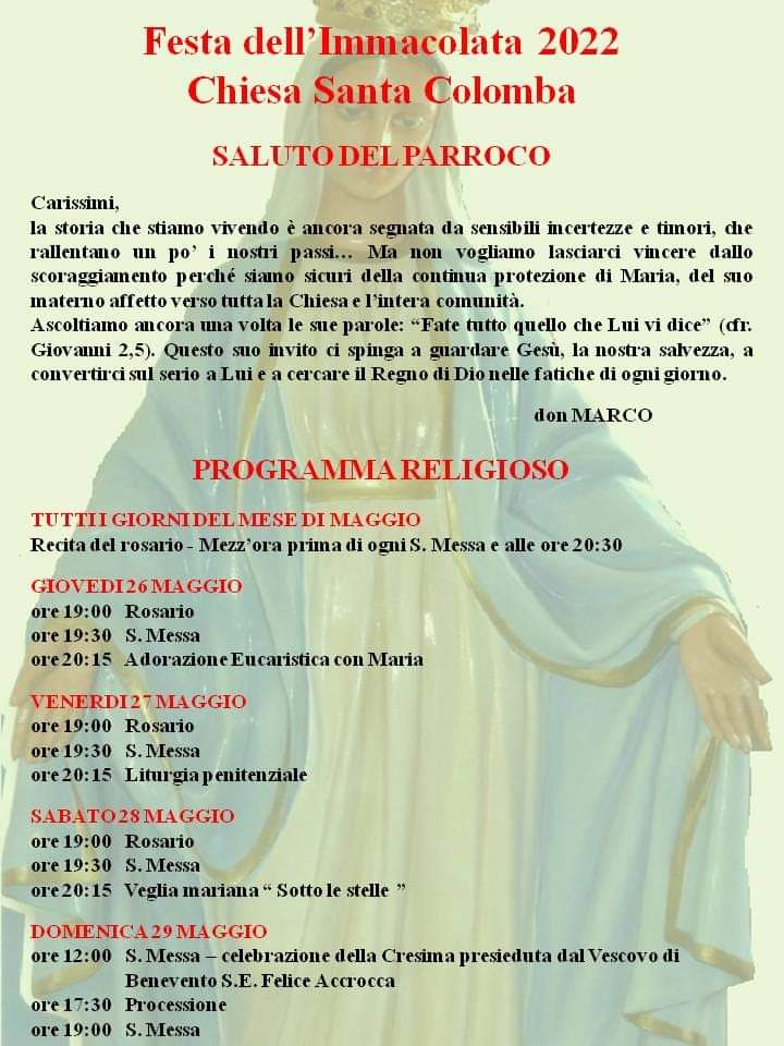 Il mese di maggio a S. Colomba in Benevento Festeggiamenti religiosi per l’Immacolata Concezione nella chiesa Santa Colomba a Benevento per il mese di maggio. Per il programma vedi il manifesto…