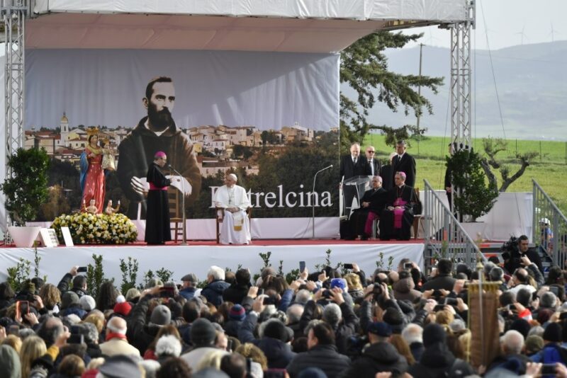Santità, la mia voce riassume quella della Chiesa beneventana, che esprime la propria gioia e La ringrazia per la Sua visita nella patria di san Pio da Pietrelcina. San Pio è un figlio di questa terra, ne ha respirato a pieni polmoni la cultura contadina: una cultura che va all’essenziale, basata sui fatti concreti più che sulle parole. A Lei, successore di Pietro, chiediamo di essere confermati nella fede (Lc 22,32); a Lei, vescovo della Chiesa di Roma, che nella carità presiede a tutte le altre Chiese, domandiamo di essere spronati nella sequela di Cristo.
