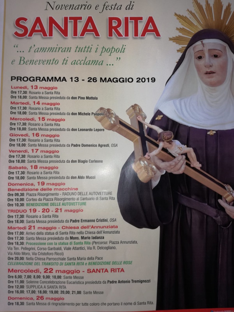 A Benevento si festeggia santa Rita nella parrocchia santa Maria della Pace e santuario santa Rita da Cascia, guidati dal parroco don Teodoro Rapuano. Questo il programma: Martedì, 21 maggio: i fedeli sono invitati a partecipare alla solenne processione, che dopo la santa messa delle 17,30; partirà dalla chiesa dell’Annunziata e attraverserà via ten. Pellegrini, corso Garibaldi, viale degli Atlantici, via Pace Vecchia, via R. Delcogliano, via Aldo Moro, via Cristoforo Ricci. Quindi, la statua della Santa farà ritorno nel santuario, dove alle ore 20 sarà rivissuto il transito di santa Rita e la benedizione delle rose.