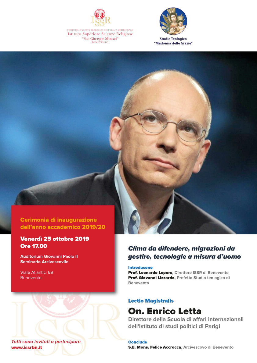 Venerdì 25 ottobre alle ore 17 presso l’auditorium “Giovanni Paolo II” del seminario arcivescovile di Benevento ci sarà l’inaugurazione dell’anno accademico 2019 – 2020, dell’Istituto superiore scienze religiose “San Giuseppe Moscati” e dello Studio teologico “Madonna delle Grazie”. S’inizierà con i saluti del prof. Leonardo Lepore, direttore dell’Istituto superiore di scienze religiose e del prof. Giovanni Liccardo, prefetto dello Studio teologico “Madonna delle Grazie” e poi la lectio magistralis dell’on. Enrico Letta, direttore della Scuola di affari internazionali dell’Istituto di studi politici di Parigi, sul tema: «Clima da difendere, migrazioni da gestire, tecnologie a misura d’uomo»; concluderà l’arcivescovo di Benevento mons. Felice Accrocca. http://issrbn.it/