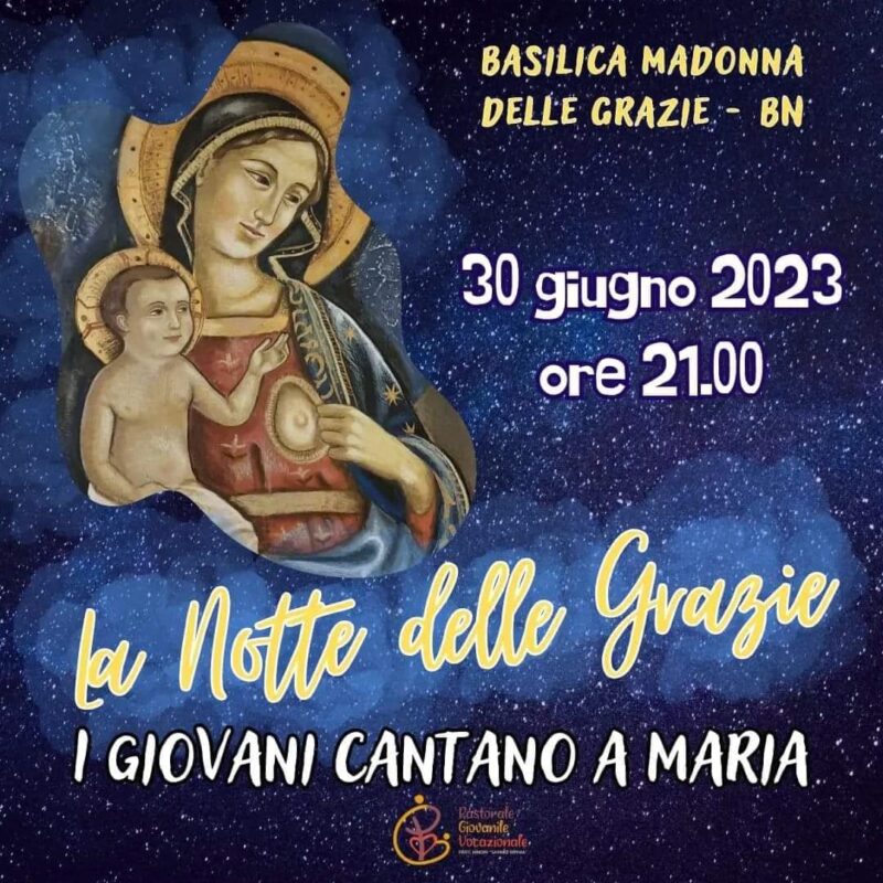 La Pastorale Giovanile dei Frati minori, in collaborazione con le parrocchie di Benevento hanno organizzato un incontro di preghiera presso la basilica della Madonna delle Grazie. Appuntamento il 30 giugno 2023, alle ore 21, per “La notte delle Grazie” i giovani cantano a Maria.