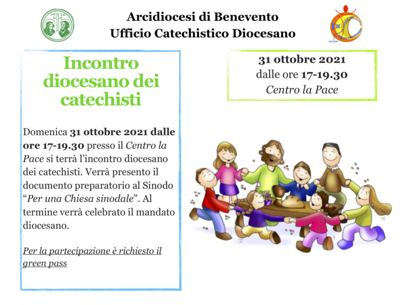 L’ufficio catechistico diocesano ha organizzato un incontro dei catechisti per domenica 31 ottobre. Appuntamento al Centro la Pace, dalle ore 17 alle ore 19,30,  per presentare il documento preparatorio al Sinodo “Per una Chiesa sinodale”. Al termine verrà celebrato il mandato diocesano. Per la partecipazione è richiesto il green pass.