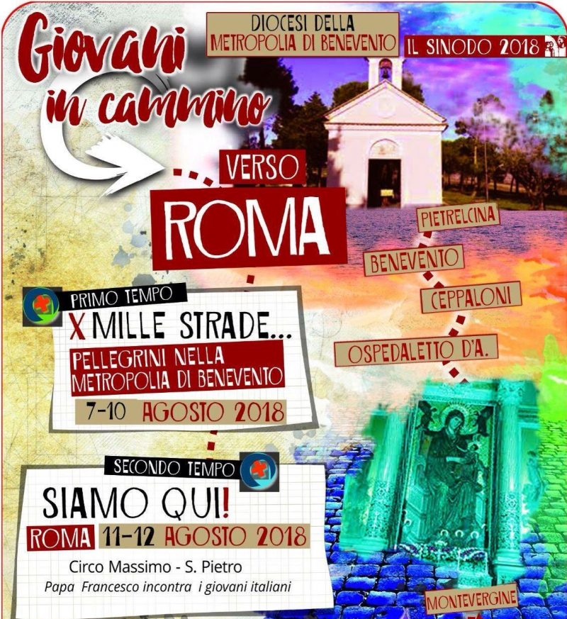 Alla vigilia del Sinodo che si terrà ad ottobre 2018, Papa Francesco incontrerà a Roma, l’11 e il 12 agosto, i giovani Italiani che arriveranno nella capitale dopo aver marciato nelle loro diocesi durante la settimana precedente. La pastorale giovanile di Benevento ha programmato il cammino diocesano, condividendolo con le altre diocesi della Metropolia (Avellino, Ariano Irpino, Cerreto-Telese-Sant’Agata dei Goti, Montevergine e S. Angelo dei Lombardi-Conza-Nusco-Bisaccia) e la diocesi di Teano Calvi. La marcia avrà il seguente itinerario: 7 agosto nel pomeriggio – ritrovo a Pietrelcina da dove si partirà alla volta di Benevento (12 Km); 8 agosto da Benevento in marcia verso Ceppaloni (13 km); 9 agosto da Ceppaloni in marcia verso Ospedaletto d’Alpinolo (17 Km); 10 agosto da Ospedaletto d’Alpinolo scalata al santuario di Montevergine (8 km); 11 agosto in pullman a Roma; 12 agosto con pullman rientro da Roma. Per informazioni contattare l’ufficio di Pastorale giovanile tel. 0824/323314, dal lunedì al sabato, dalle ore 9 alle ore 12 (giovedì escluso) o inviando mail a: pastoralegiovanile@diocesidibenevento.it.
