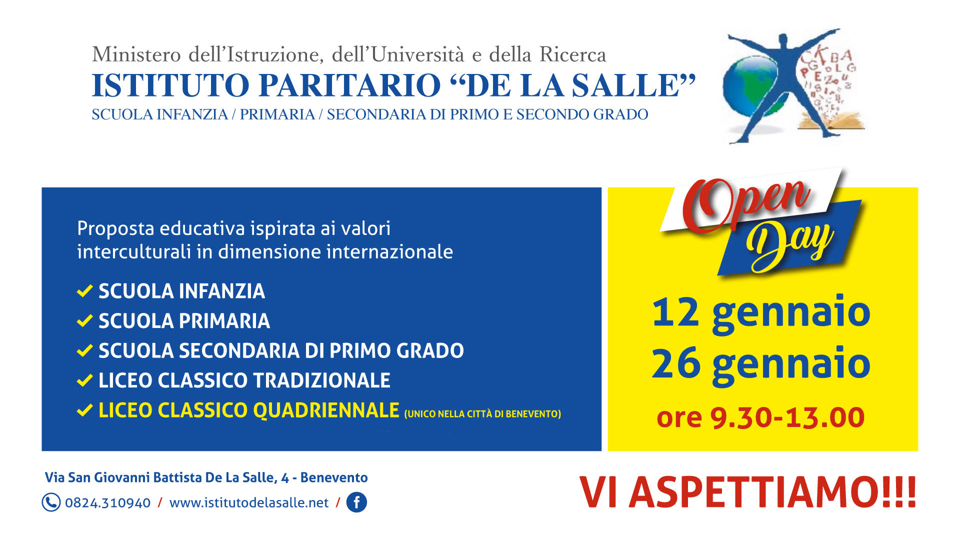 Successo per “l’Open Day” dell’Istituto paritario “De La Salle” di Benevento all’insegna dell’innovazione nella tradizione. Le porte della scuola si sono aperte per far conoscere l’offerta formativa ed i servizi agli studenti dello storico istituto di formazione sannita. L’istituto copre tutti i cicli di formazione: infanzia, prima, secondaria di primo e di secondo grado. Fiore all’occhiello della nuova stagione scolastica resta il liceo classico quadriennale, unico nella città di Benevento, che permette ai giovani di godere di una formazione classica di alto livello concludendo, in linea con gli standard della formazione europea, il percorso di studio superiore con un anno di anticipo. Prossimo appuntamento di “Open Day” il 26 gennaio 2019.