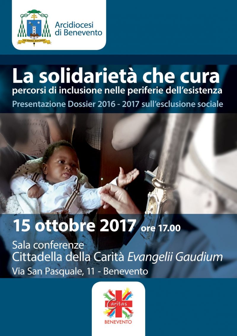 “La solidarietà che cura. Percorsi di inclusione nelle periferie dell’esistenza”: è questo il titolo dell’edizione 2016/2017 del Dossier sull’esclusione sociale di Caritas Benevento, che sarà presentato domenica 15 ottobre alle ore 17 nella Sala conferenze della Cittadella della Carità “Evangelii Gaudium”, in via San Pasquale 11. Ad introdurre la conferenza i saluti del Direttore della Caritas Diocesana di Benevento, don Nicola De Blasio; presenterà il Dossier la Responsabile dell’Osservatorio Povertà e Risorse di Caritas Benevento, dott.ssa Mariapia Mercaldo. A chiudere gli interventi l’Arcivescovo Metropolìta di Benevento, mons. Felice Accrocca. Il nuovo Dossier rappresenta la sintesi di quanto fatto da Caritas Benevento in questo anno: progetti, attività innovative per un nuovo modello di welfare che mette al centro sempre l’assistenza alla persona che diventa welcome.