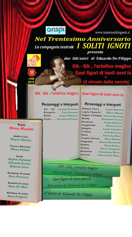Quest’anno la Compagnia Teatrale “I Soliti Ignoti” dell’ANSPI di Benevento festeggia il 30° compleanno ( ma per la verità gli anni sarebbero 32) e opera da sempre al Rione Libertà, precisamente nel sottoscala della Canonica della SS. Addolorata. 24 commedie, 3 drammi sacri, monologhi, scketch, recital, numerosi spettacoli finalizzati alla raccolta fondi per importanti istituti di ricerca, rappresentazioni nelle carceri, nelle scuole-prigioni e nei centri sociali. Partecipazione a Concorsi, Festival e Rassegne di Teatro amatoriale da Reggio Emilia a Reggio Calabria su e giù per l’Italia. Nel corso di questi 30 anni siamo stati in scena circa 400 volte, oltre 300 i partecipanti tra attori, tecnici, scenografi, attrezzisti e truccatori. La soddisfazione arriva nel 2004 quando, tra 12 Compagnie provenienti da tutt’Italia, vincemmo il “Festival di Teatro Spontaneo” di Arezzo. Teatro in dialetto, in lingua, in costume, borghese, vari stili e tanti autori. Per celebrare adeguatamente il 30° anniversario di “ininterrotta” attività , la Compagnia ha preparato 2 atti unici del grande Eduardo De Filippo – “Sik-Sik, l’artefice magico” e “Quei figuri di tanti anni fa”- che saranno rappresentati nella stessa serata, con rapido cambio scena, sabato 27 ottobre, alle ore 20.30, al Teatro Massimo di Benevento.