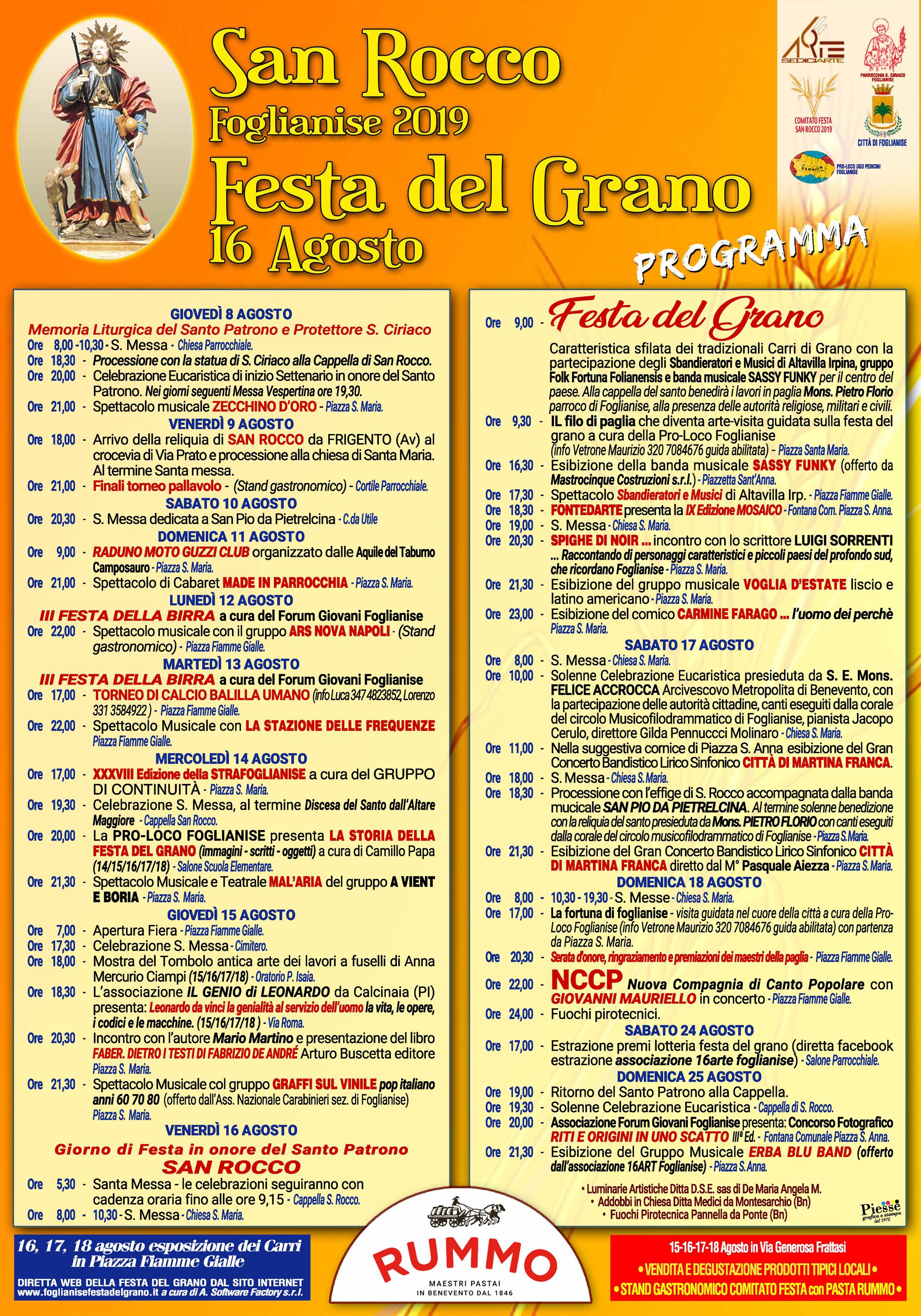 Rivive ed esercita sempre un fascino straordinario la festa del grano a Foglianise. L’evento di tradizione e fede celebra le incomparabili gesta di san Rocco. Lungo le vie del paese, il 16 agosto, sfileranno i carri simbolo di arte e spiritualità. Di rilievo la mostra sul grande genio “Leonardo da Vinci”, che ha ottenuto un buon riscontro di pubblico nelle più importanti città italiane. In esposizione anche l’artigianato ed il tombolo. I falegnami hanno preparato le strutture per i carri, che quest’anno saranno 21. Il casale “Palazzo” si è rituffato nella tradizione realizzando la macchina del volo, prototipo universalmente conosciuto di Leonardo. Il programma ricco e articolato comincerà l’8 e terminerà il 25 agosto con il ritorno della statua di San Rocco nella cappella a lui dedicata. Il 17 agosto la solenne messa delle ore 10 sarà celebrata dall’arcivescovo metropolita di Benevento mons. Felice Accrocca. Vedi manifesto allegato…
