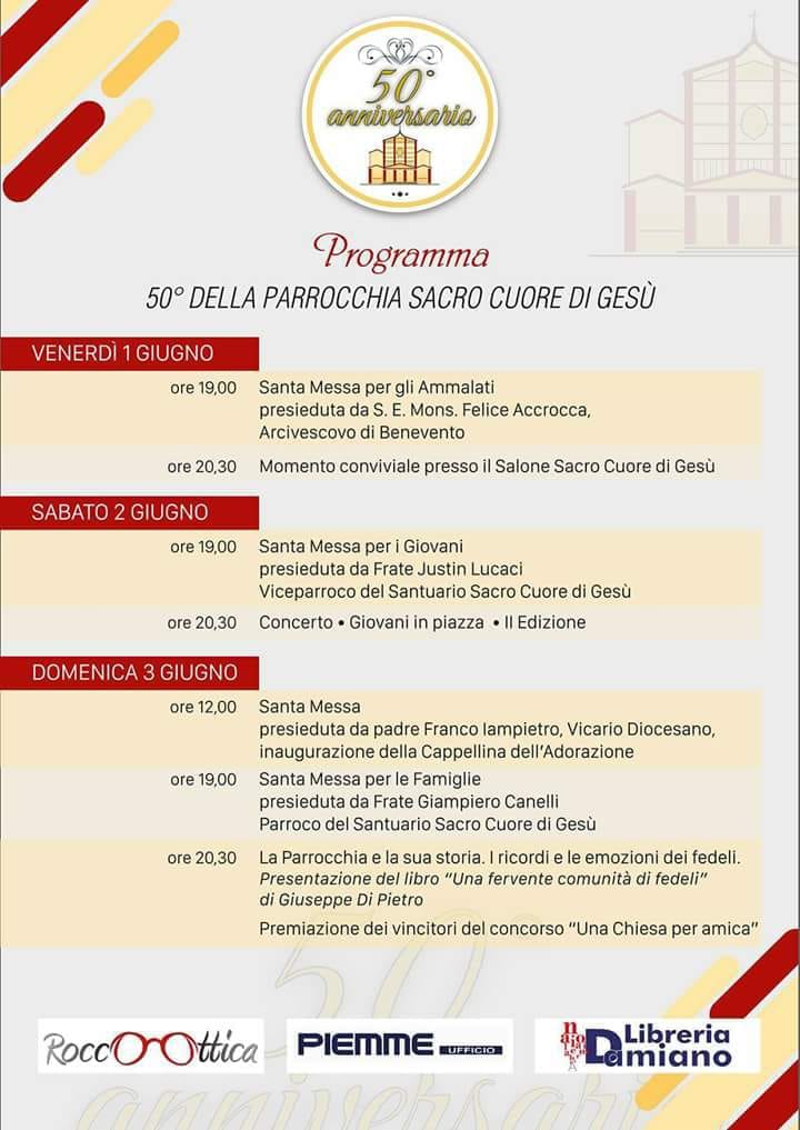 Il 1° giugno del 1968 mons. Raffaele Calabrìa, arcivescovo Metropolita di Benevento, consacrava la chiesa parrocchiale e l’altare maggiore in onore del Sacro Cuore di Gesù nella zona alta di Benevento. A 50 anni da quel momento storico, religioso e civile, la comunità dei fedeli della parrocchia, e non solo, si riunisce insieme ai sacerdoti per ricordare, festeggiare e parlare della storia di uomini e donne che hanno fatto vivere negli anni il luogo sacro. Le famiglie, i gruppi, le singole persone che amano questo luogo si incontreranno per pregare e racconteranno degli anni trascorsi durante i quali la parrocchia ha vissuto le gioe e le speranze, le tristezze e le angosce degli abitanti del quartiere. Il programma prevede: venerdì 1° giugno – Inaugurazione Anno Giubilare, ore 19 santa messa per gli ammalati, presieduta da mons. Felice Accrocca, arcivescovo di Benevento, ore 20,30 momento conviviale presso il salone Sacro Cuore di Gesù; sabato 2 giugno alle ore 19 santa messa per i giovani, presieduta da Frate Juston Lucaci, viceparroco del santuario Sacro Cuore di Gesù, ore 20,30 concerto “Giovani in piazza” II edizione; domenica 3 giugno alle ore 12 santa messa, presieduta da mons. Francesco Iampietro, vicario diocesano, e inaugurazione della cappellina dell’adorazione, ore 19 santa messa per le famiglie, presieduta da frate Giampiero Canelli parroco del santuario Sacro Cuore di Gesù, ore 20 la Parrocchia e la sua storia, presentazione del libro sui 50 anni della parrocchia, scritto da Giuseppe Di Pietro, durante la serata I ricordi e le emozioni dei fedeli, e la premiazione dei vincitori del concorso “Una chiesa per amica”.