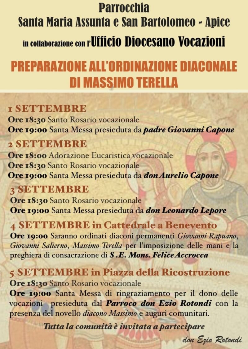 La parrocchia di Apice prega per il nuovo diacono permanente La parrocchia Santa Maria Assunta e S. Bartolomeo in Apice ha avviato una preparazione spirituale per l’ordinazione diaconale di Massimo Terella. Per il programma vedi il manifesto…