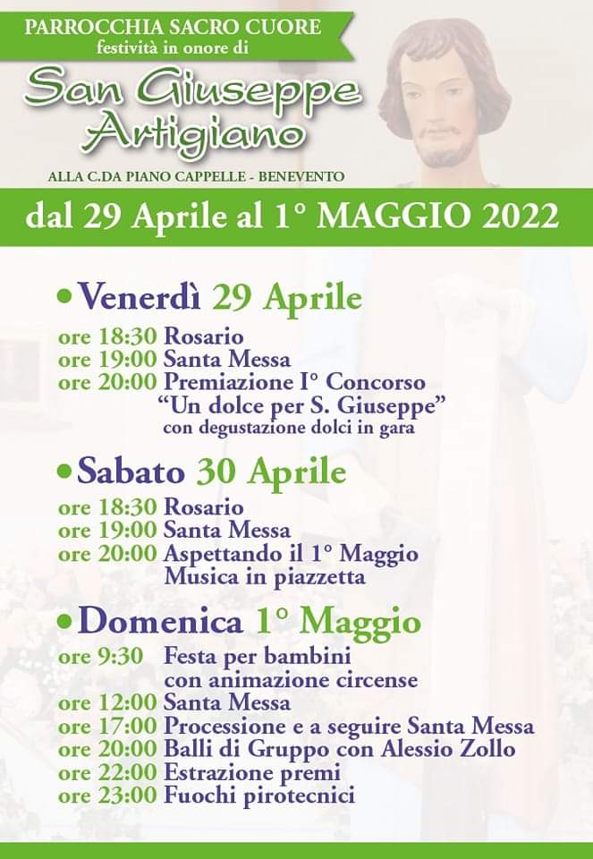 La parrocchia “Sacro Cuore” di Benevento festeggia San Giuseppe Artigiano La parrocchia “Sacro Cuore” di Benevento festeggia San Giuseppe Artigiano nella chiesetta di Piano Cappella. Per il programma vedi il manifesto…
