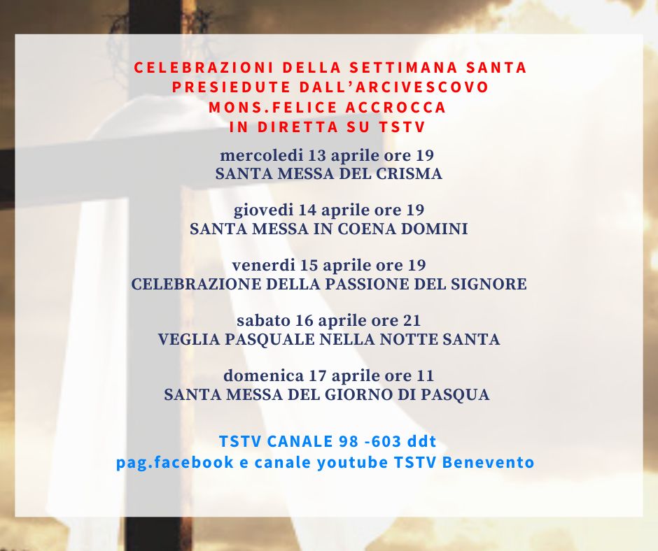 L’Ufficio liturgico della diocesi comunica il calendario delle celebrazioni, che saranno presiedute in Cattedrale dall’arcivescovo mons. Felice Accrocca e trasmesse in diretta dall’emittente Telesperanza canale 98 e 603 del digitale terrestre oltre che sul canale youtube e sulla pagina facebook dell’emittente.