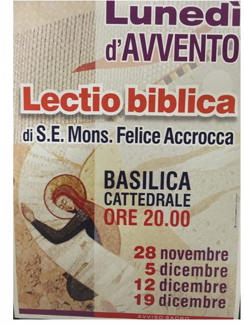 A partire da lunedì 28 novembre alle ore 20, e per le successive tre settimane (5 dicembre, 12 dicembre, 19 dicembre), mons. Felice Accrocca arcivescovo metropolita di Benevento terrà, nella Cattedrale cittadina una serie di lectio bibliche in preparazione al santo Natale.