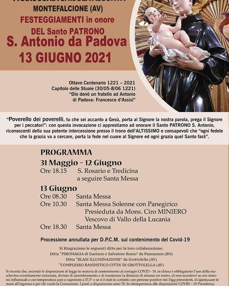 Montefalcione festeggiamenti in onore del Patrone A Montefalcione festeggiamenti il 13 giugno per S. Antonio da Padova. Per il programma vedi il manifesto…