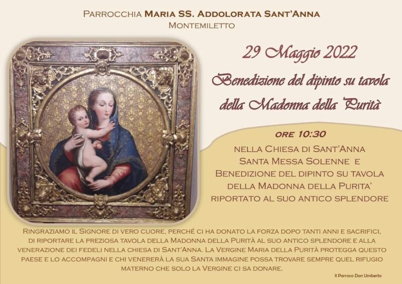Montemiletto, benedizione del dipinto della Madonna Domenica 29 maggio a Montemiletto benedizione del dipinto della Madonna della Purità.
