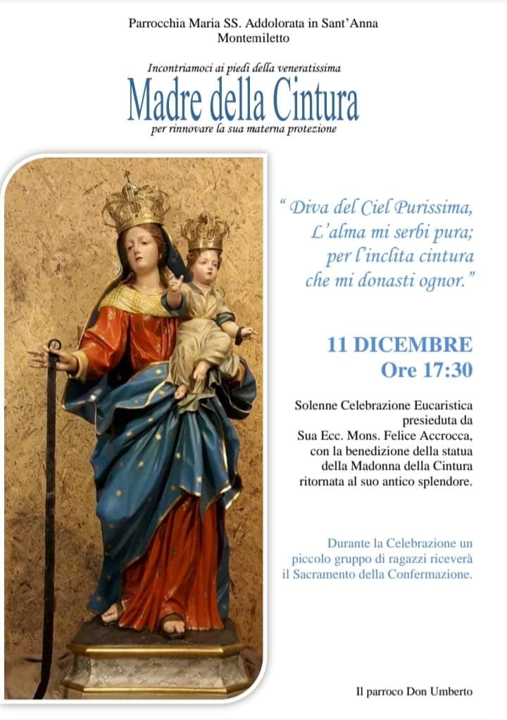 A Montemiletto l’11dicembre, alle ore 17,30, solenne celebrazione eucaristica presieduta dall’arcivescovo mons. Felice Accrocca e benedizione della restaurata statua della Madonna della cintura. Per l’intero programma vedi il manifesto…