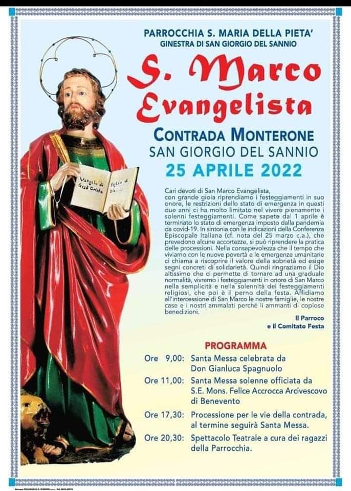 Monterone: festa in onore di San Marco evangelista Torna la tradizionale festa in onore di San Marco Evangelista che, come sempre, si terrà alla contrada Monterone in San Giorgio del Sannio il prossimo 25 aprile. Per il programma vedi il manifesto…