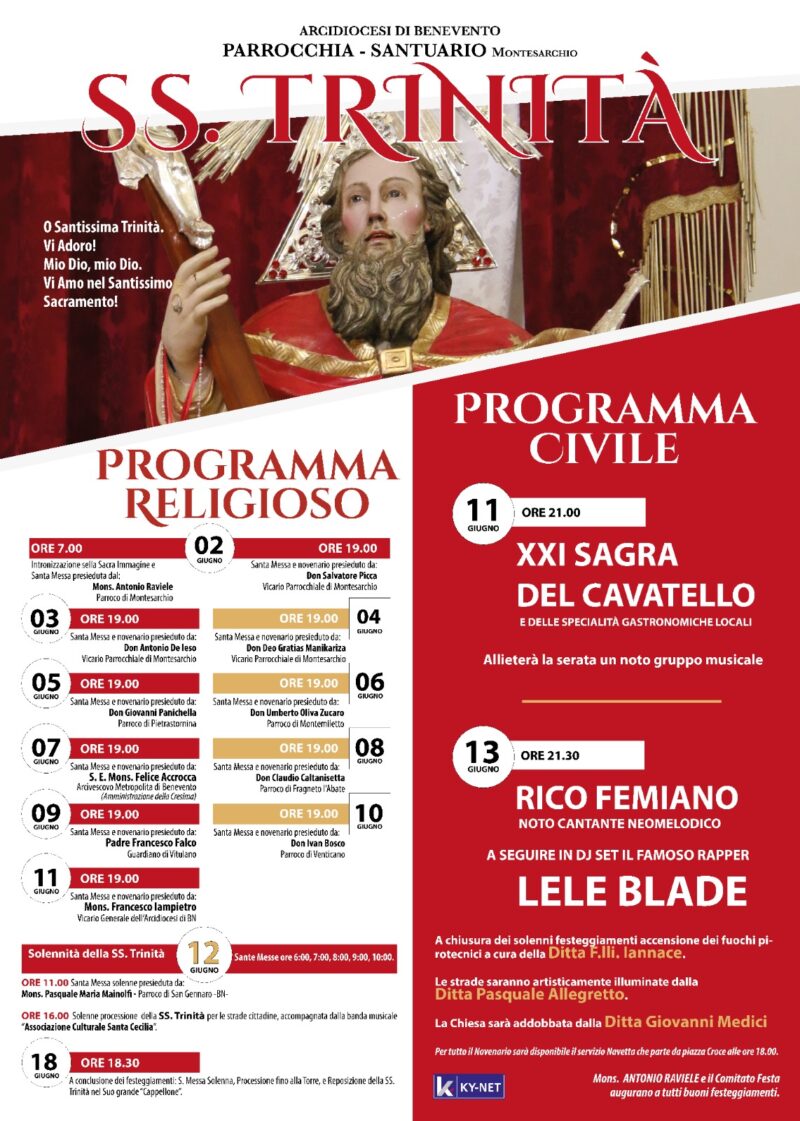 Montesarchio; festa della SS. Trinità La parrocchia-santuario SS. Trinità di Montesarchio ha organizzato i festeggiamenti religiosi e civili per la SS. Trinità. Per il programma vedi il manifesto…