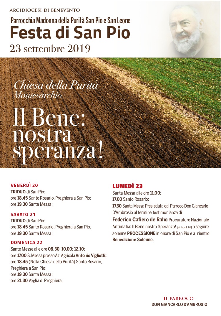 Don Giancorlo D’ambrosio parroco della parrocchia “Madonna della Purità, San Pio e San Leone in Montesarchio ha organizzato dal 20 settembre al 26 settembre i festeggiamenti per San Pio da Pietrelcina. Luned’ 23 settembre dopo la santa messa delle ore 17,30 ci sarà la testimonianza sul tema: “Il Bene nostra Speranza!” di Federico Cafiero de Raho, procuratore nazionale antimafia. Per l’intero programma vedi il manifesto…