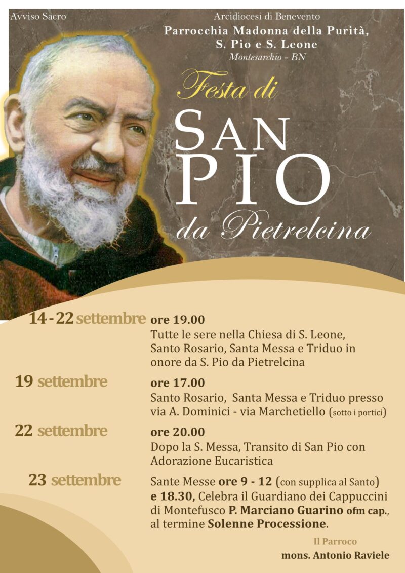 Montesarchio festeggia San Pio La parrocchia Madonna della Purità, S. Pio e S. Leone di Montesarchio festeggia San Pio da Pietrelcina dal 14 al 23 settembre. Per il programma vedi il manifesto…