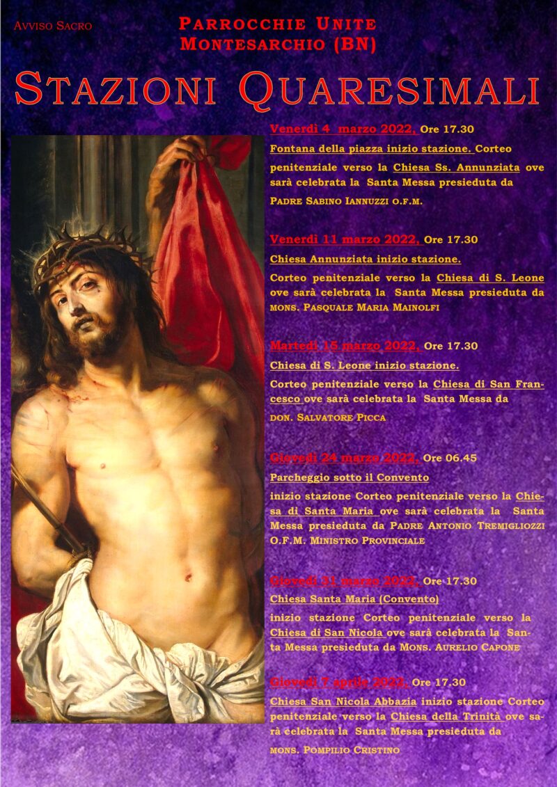Le parrocchie unite di Montesarchio hanno programmato per la quaresima 2022 le Stazioni quaresimali. Per il programma vedi il manifesto…