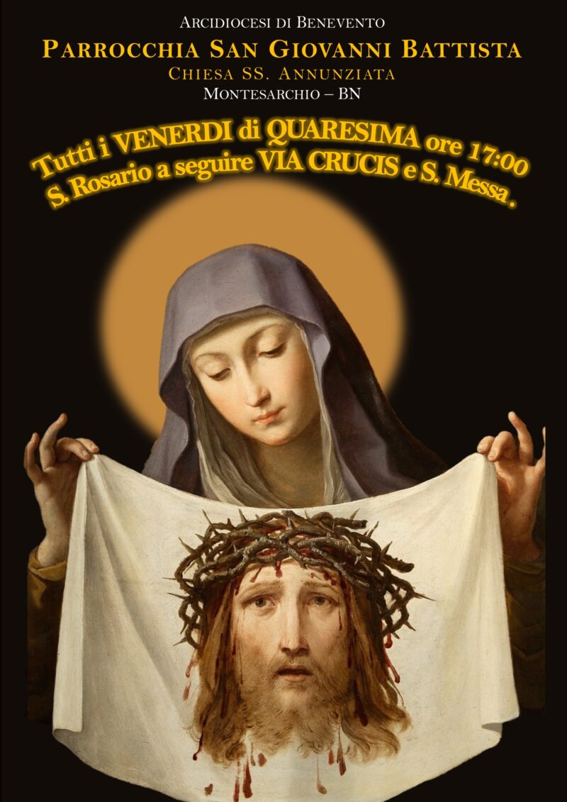 Montesarchio: via Crucis ogni venerdì di Quaresima Nella parrocchia di San Giovanni Battista, chiesa della Santissima Annunziata, in Montesarchio si terrà la via Crucis tutti i venerdì di Quaresima alle ore 17.