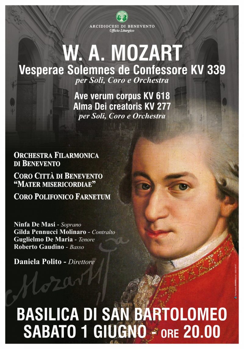 Sabato 1° giugno, alle ore 20,presso la Basilica di San Bartolomeo al corso Garibaldi di Benevento esecuzione dei Vesperae Solemnes de Confessore KV 339 per soli, coro, orchestra e organo di W.A. Mozart a cura dell’orchestra Filarmonica di Benevento, del coro Città di Benevento “Mater Misericordiae” e del coro Polifonico Farnetum, diretto dal maestro concertatore Daniela Polito. Con la partecipazione di Ninfa De Masi, soprano; di Gilda Pennucci Molinaro, contralto; di Emanuele Rossi, tenore e di Anton Grivniak, basso.