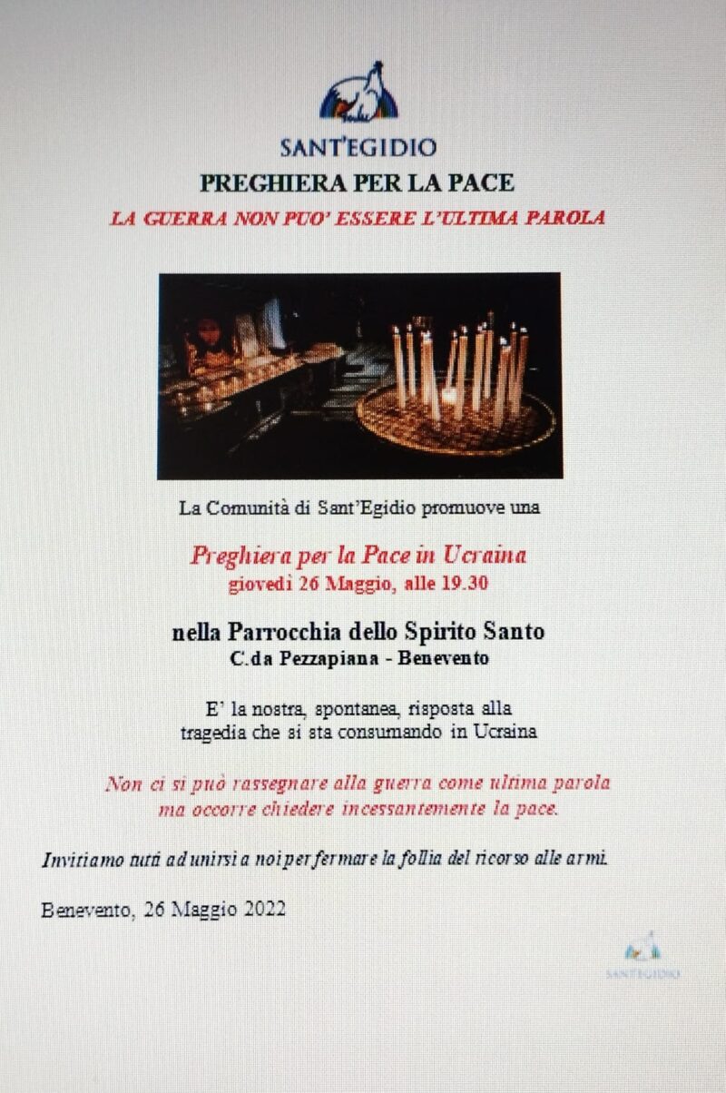 Nella parrocchia dello Spirito Santo si prega per la Pace La comunità di Sant’Egidio promuove una preghiera per la Pace in Ucraina, giovedì 26 maggio, alle ore 19,30 , nella parrocchia dello Spirito Santo a contrada Pezzapiana in Benevento.