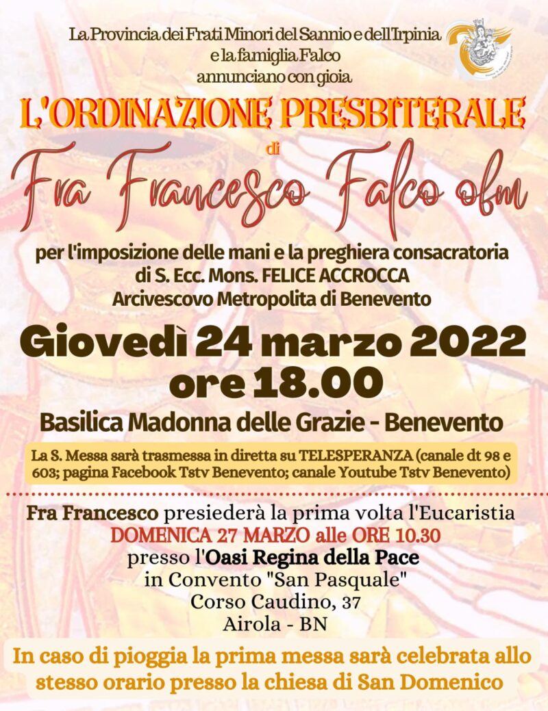 La Provincia dei Frati Minori del Sannio e dell’Irpinia e la famiglia Falco annunciano con gioia l’ordinazione presbiterale di Fra Francesco Falco ofm per l’imposizione delle mani e la preghiera consacratoria dell’arcivescovo metropolita di Benevento mons. Felice Accrocca giovedì 24 marzo, alle ore 18, nella basilica Madonna delle Grazie di Benevento. La S. Messa sarà trasmessa su Telesperanza (canale dt 98 e 603; pagina facebook Tstv Benevento; canale yotube Tstv Benevento).