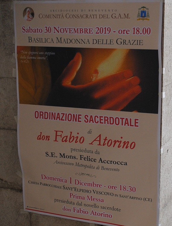 La Chiesa beneventana è in festa per l’ordinazione sacerdotale di don Fabio Atorino della comunità consacrati del G.A.M.  Don Fabio sarà ordinato sacerdote, sabato 30  novembre alle ore 18, nella Basilica della Madonna delle Grazie di Benevento  dall’arcivescovo metropolita di mons. Felice Accrocca.