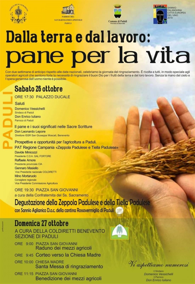 Con due settimane di anticipo rispetto alle date nazionali, celebriamo la giornata del ringraziamento. È rivolta a tutti, in modo speciale agli operatori agricoli che sentono forte la necessità di ringraziare il buon Dio per i frutti della terra e del loro lavoro. Senza la mano del cielo e l’opera generosa dell’uomo niente è possibile.