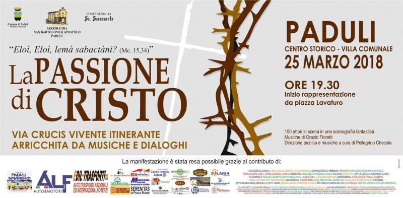 Anche quest’anno in occasione della Domenica delle Palme a Paduli si rivivrà la suggestiva rappresentazione della Passione di Cristo, organizzata dalla parrocchia San Bartolomeo Apostolo, dalla confraternita del SS. Sacramento con il patrocinio del comune di Paduli. Nuova location, per questa edizione 2018, il centro storico con partenza da piazza Lavaturo e conclusione in villa comunale con la scena della crocifissione. Appuntamento dunque per domenica 25 marzo a Paduli alle ore 19.30.
