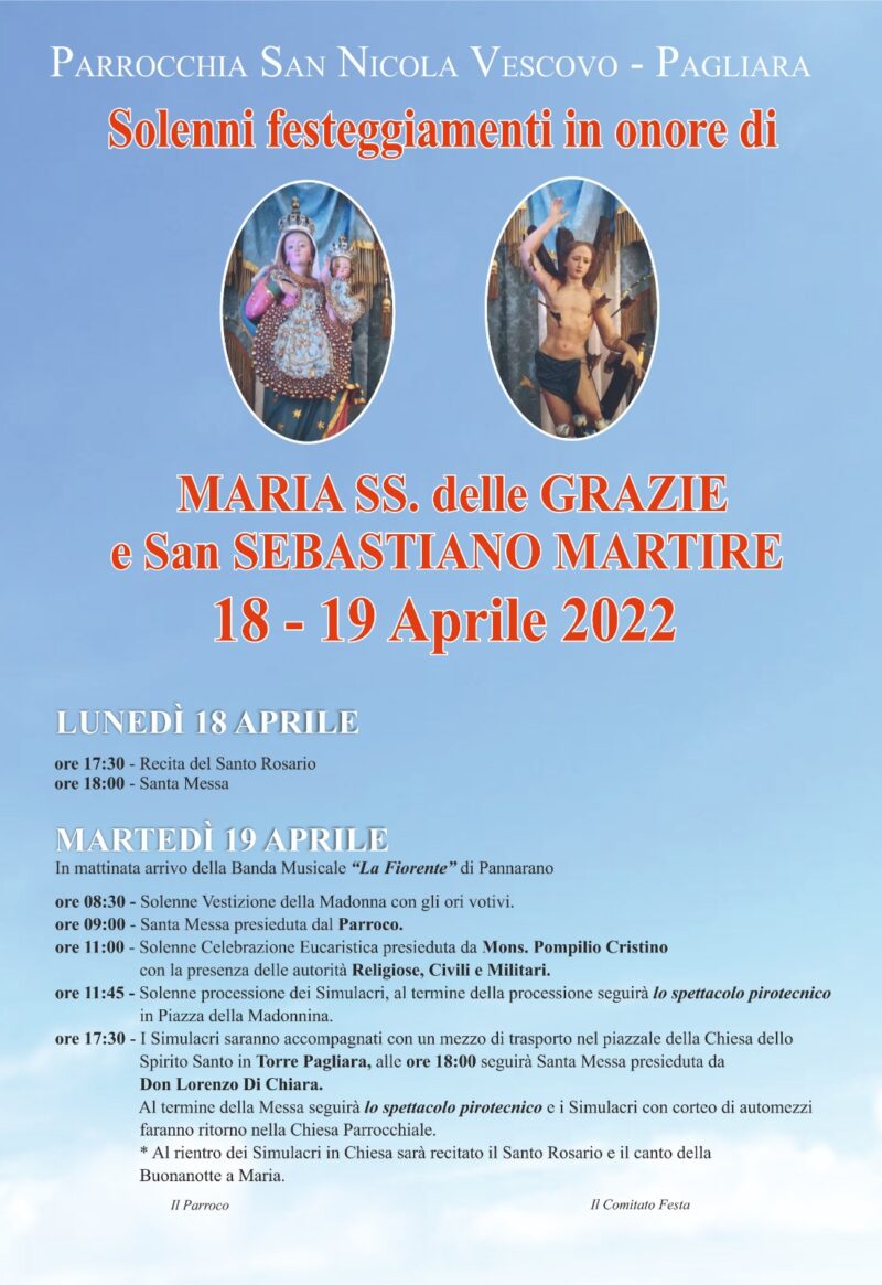 La parrocchia di San Nicola vescovo di Pagliara, frazione di San Nicola Manfredi, festeggia il 18 e 19 aprile 2022 Maria SS. delle Grazie e San Sebastiano. Per il programma vedi il manifesto…
