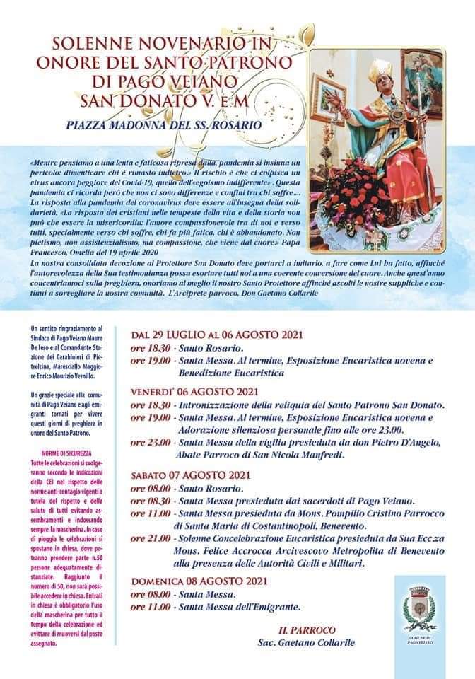 Pago Veiano solenne novenario per S. Donato La comunità di Pago Veiano festeggia il patrono S. Donato. Per il programma vedi il manifesto…