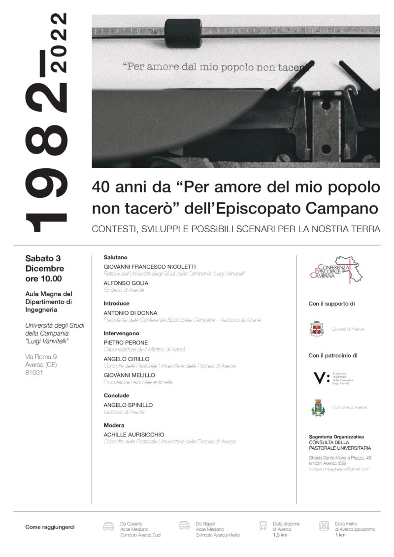 Ad Aversa, sabato 3 dicembre 2022 ore 10.00, si terrà il convegno della Conferenza Episcopale Campana (CEC) in memoria dei quarant’anni trascorsi dalla pubblicazione del documento pastorale “Per amore del mio popolo non tacerò” dei Vescovi della Regione. Ad ospitare la manifestazione, presso l’Aula magna di Via Roma 9, sarà il Dipartimento di Ingegneria dell’Università degli Studi della Campania “Luigi Vanvitelli”.
