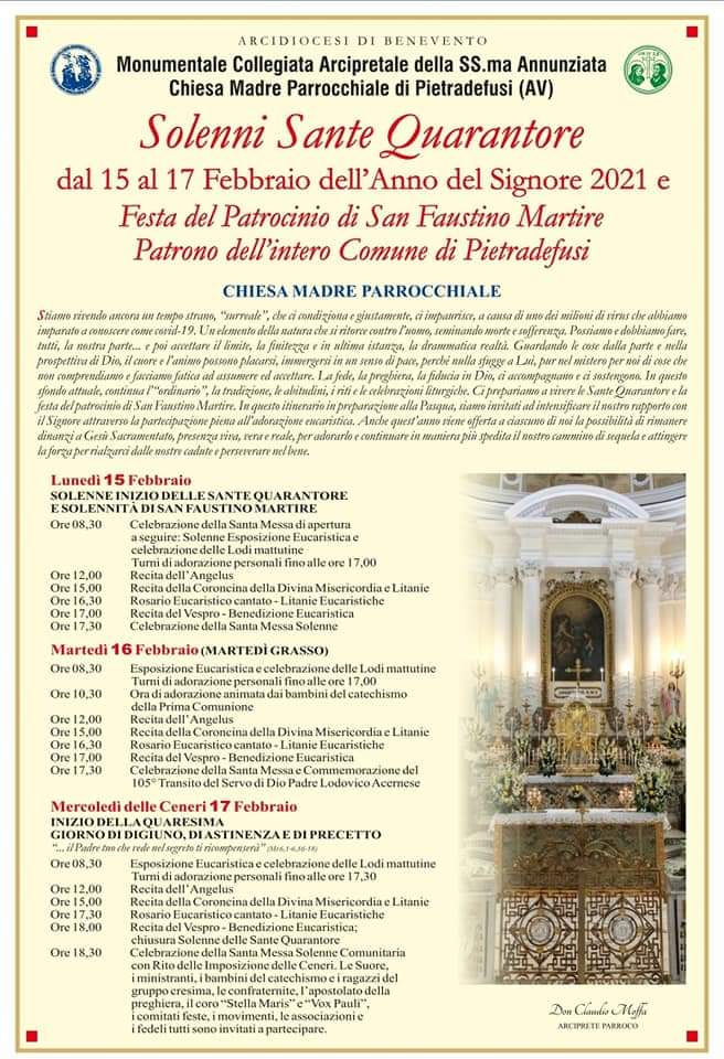 Pietradefusi: solenni quarantore La parrocchia Maria Santissima Annunziata di Pietradefusi (Av) ha organizzato le solenni sante quarantore… per il programma vedi il manifesto