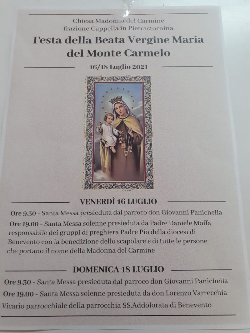 Pietrastornia: festa della Vergine del Carmelo Dal 16 al 18 luglio a Pietrastornina festeggiamenti religiosi per la Madonna del Carmelo. Per il programma vedi il manifesto…