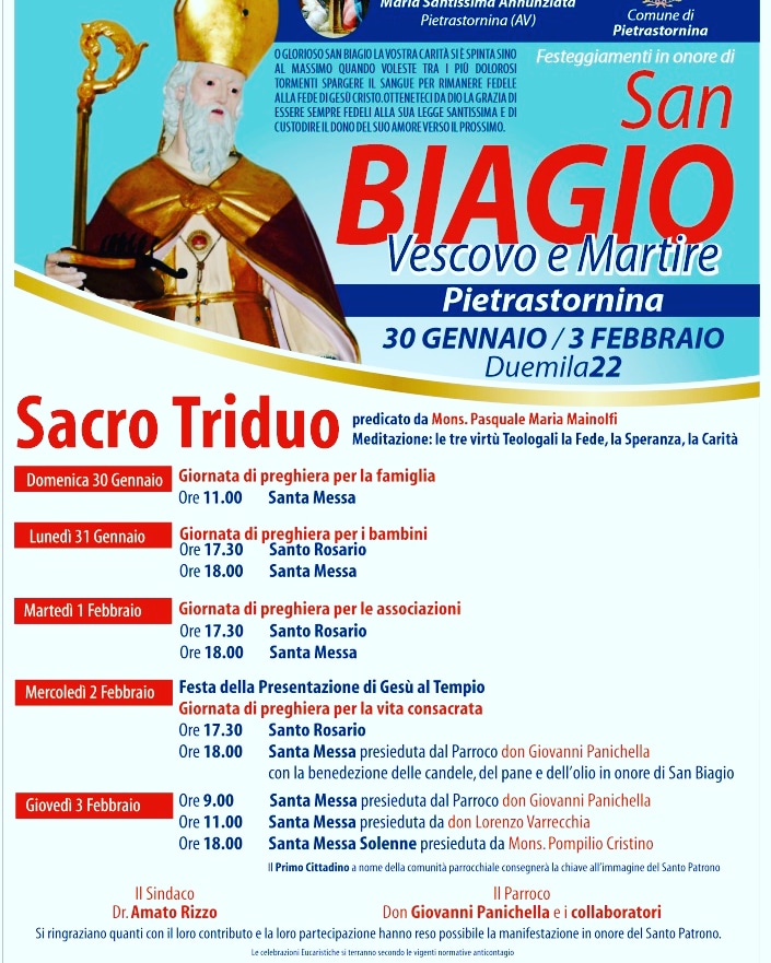 La parrocchia “Maria Santissima Annunziata” Pietrastornina (Av), guidata dal parroco don Giovanni Panichella, ha organizzato i festeggiamenti religiosi per San Biagio vescovo e martire… Per il programma vedi manifesto…